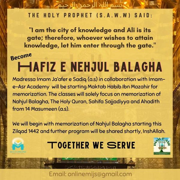 We are grateful to Khanum Hafiza Rabiya Fatema of Imam-e-Asr Academy for providing us with her unconditional support in this process of Memorization by Maktab Habib Ibn Mazahir students.